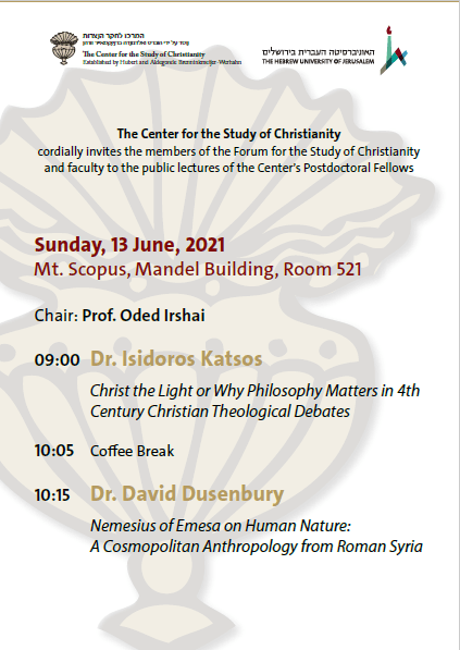 I’ll be giving a public lecture on the topic of my next book, Nemesius of Emesa on Human Nature (Oxford, 2021), this Sunday in Jerusalem.