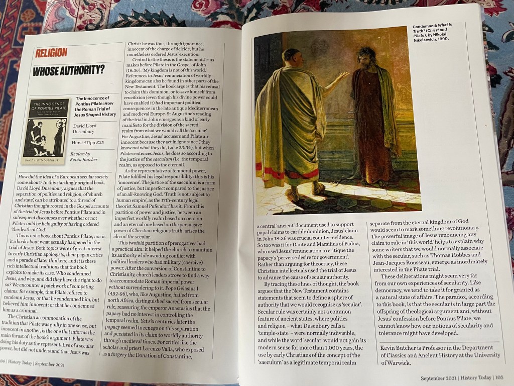 Thrilled to see a two-page review of my new book in the September issue of History Today. The University of Warwick’s Kevin Butcher calls The Innocence of Pontius Pilate “startlingly original”, & concludes: “Without Jesus’ confession before Pontius Pilate, we cannot know how our notions of secularity & tolerance might have developed.”