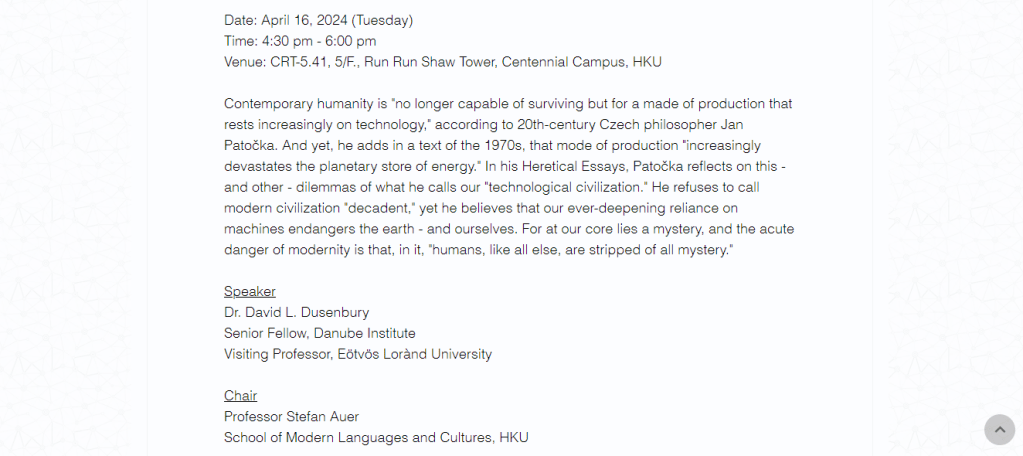 Very much looking forward to visiting The University of Hong Kong next week, on Stefan Auer’s invitation, to discuss decadence & technology in Jan Patočka’s philosophy – & then NYU Shanghai, on Bogna Konior’s invitation, to think about Leibniz’s I Ching & the origins of AI.