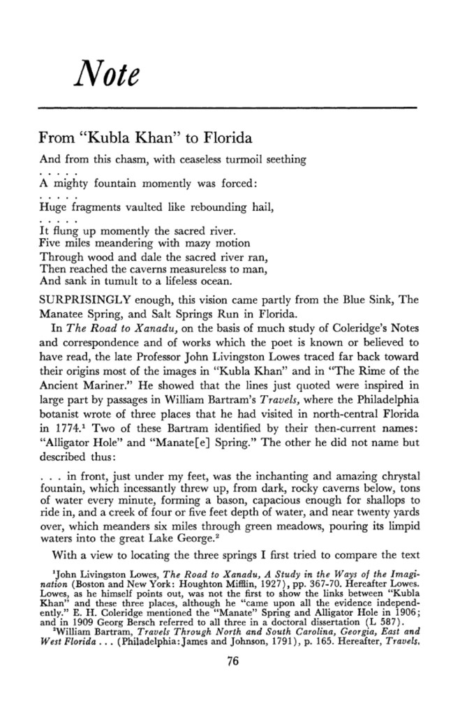 Thrilled to learn that some of the mesmerizing imagery in S. T. Coleridge’s “Kubla Khan” is inspired by travel reports from Florida. — More precisely, by STC’s reading of William Bartram’s Travels through … East & West Florida (1791).